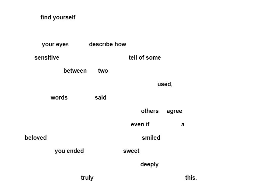 My not so well-done version of the redacted, or blackout, poem. With more interesting words, the end result could be a poem with fewer words that has, perhaps, the same meaning as the first. This is my first attempt at a redacted poem, though, so I think, not bad.